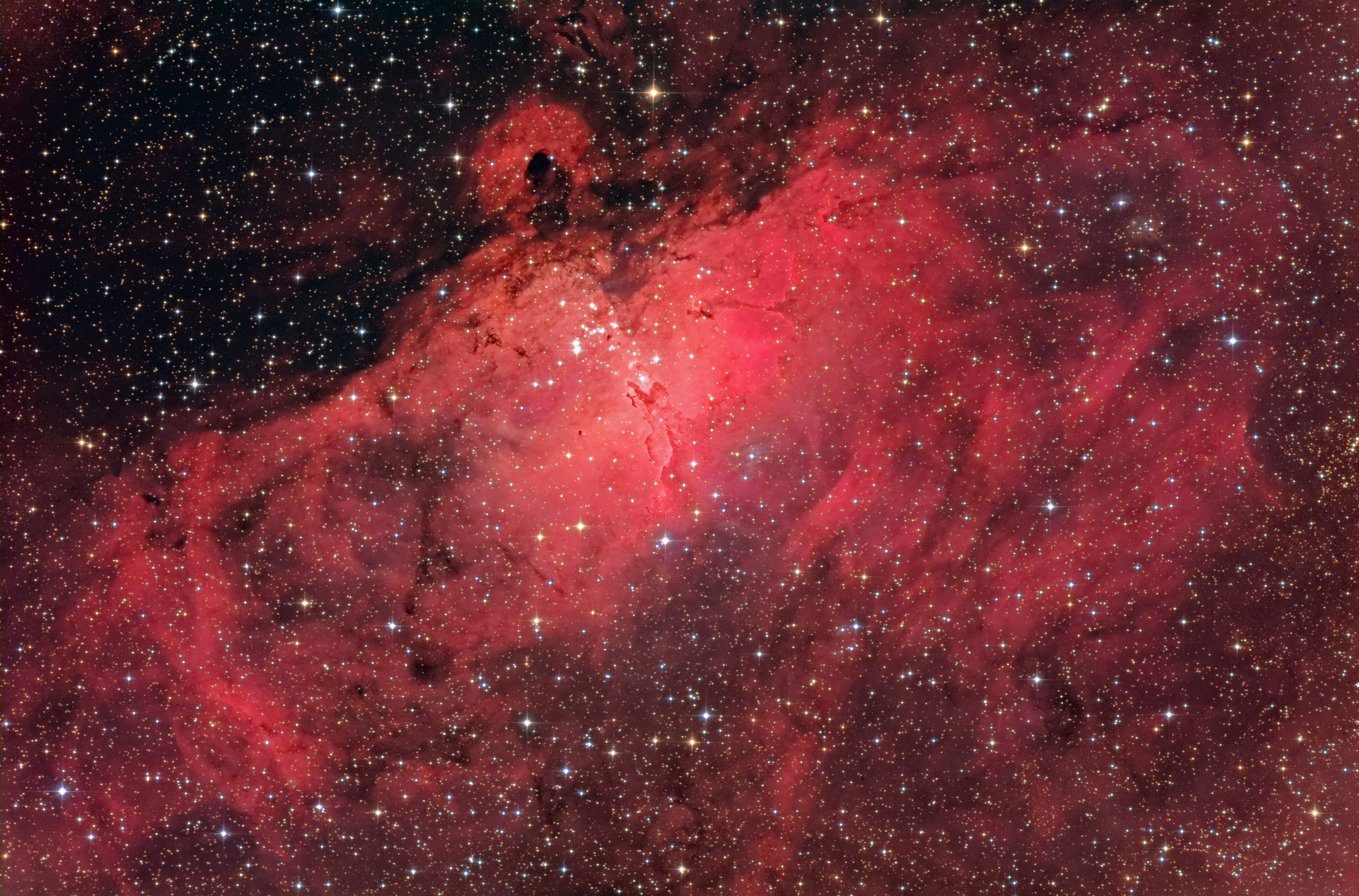 Mit einer Entfernung von 7000 Lichtjahre von der Erde befindet sich M16 im grossen Sagittarius-Spiralarm unserer Galaxis. Der Durchmesser beträgt ca. 20 Lichtjahre. Die Helligkeit liegt bei 6,4 mag. Der Sternhaufen ist aus diesen molekularen Staub- und Gaswolken hervorgegangen. Die dunklen säulenartig erscheinenden Wolken werden zunehmend von der Strahlung der kräftigen jungen Sterne aufgelöst und als „die Säulen der Schöpfung “ bezeichnet.